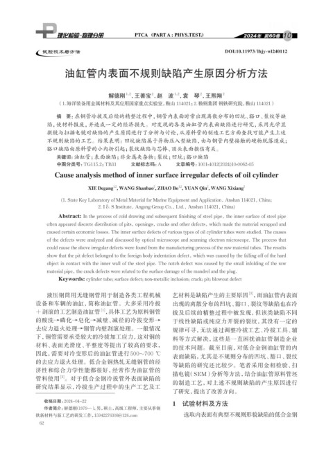 关键词: 油缸管;表面缺陷;非金属夹杂物;裂纹;凹坑;豁口缺陷